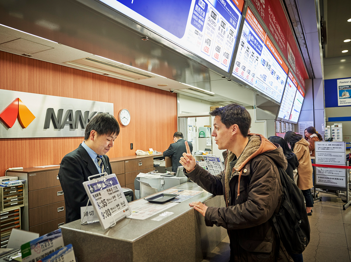 已在网上或日本国外的旅游公司完成购票,需要取票的客人请在柜台左侧排队。 需要买票的客人请在柜台右侧排队。