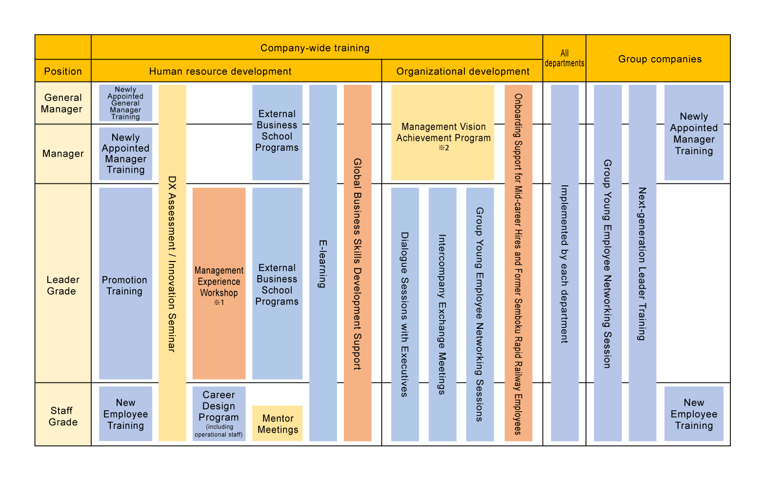 We are working to train our employees through two measures, i.e., by ensuring that they acquire the knowledge and skills required for their roles and positions through trainings for each employment level to raise the overall level of employee competencies, and by enhancing the competencies of employees who wish or are selected to acquire certifications or who participate in external business school dispatch programs.