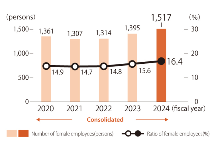 In April 2021, we formulated an "Action Plan for Promoting Women's Participation" and are working to further promote women's participation in the workplace by increasing the hiring rate of female employees and expanding opportunities for them to thrive. Furthermore, since fiscal 2020, four of our female executive officers and managers have been recognized for their multifaceted achievements, including social influence, human resource development, and community contributions, and have received the "Outstanding Female Leaders Award" from the Osaka Chamber of Commerce and Industry.