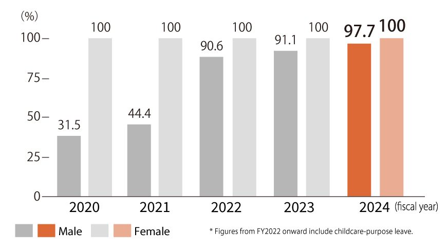 As a result, the rate of female employees taking childcare leave and returning to work after leave has been 100% for 10 consecutive years. In recent years, the number of male employees taking childcare leave has also been increasing, and the rate of male employees taking childcare leave and childcare leave in fiscal 2024 is an extremely high 97.7%.