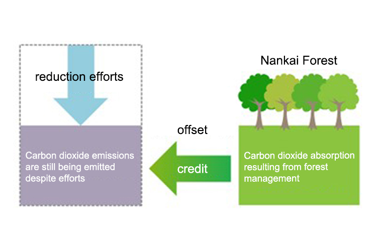 By thinning the "Nankai Forest" every year in accordance with a forestry plan, we promote CO2 absorption and obtain J-Credit. The amount of CO2 absorbed by the forest is converted into tradable "credits," which are used to offset emissions from various events.