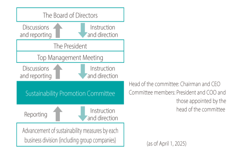 We have established the Sustainability Promotion Committee (meeting approximately twice a year) as an organization to promote sustainability measures across the entire group. This committee plays a central role in coordinating with business divisions to set goals for sustainability measures, monitor progress, promote achievement evaluations (PDCA cycle), identify climate change risks, and discuss ways to respond.