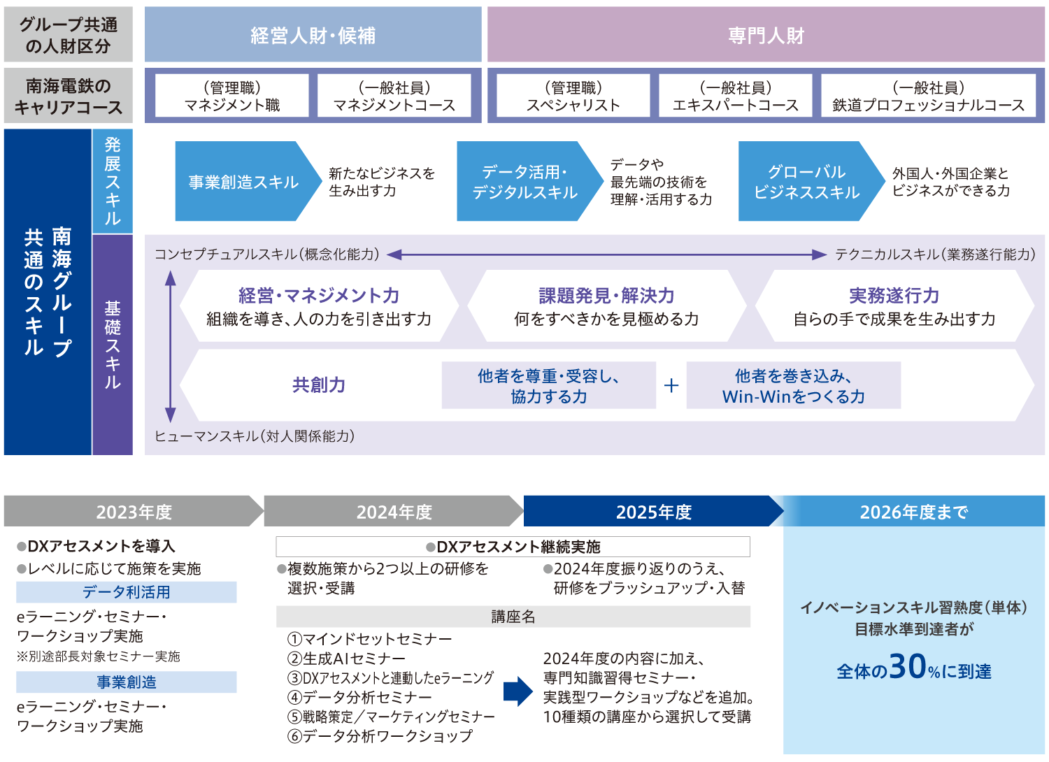 「基礎スキル」を向上する施策として、階層別やテーマ別の集合研修・eラーニングやビジネススクールへの派遣などを実施し、各役割に応じた必要な基礎スキルの習得を支援しています。一方、「発展スキル」の中でも「事業創造スキル」と「データ活用・デジタルスキル」をまとめて「イノベーションスキル」と位置づけています。