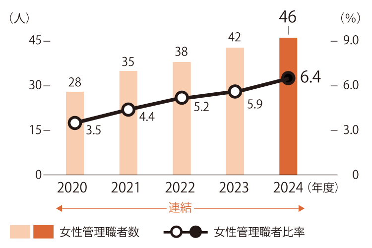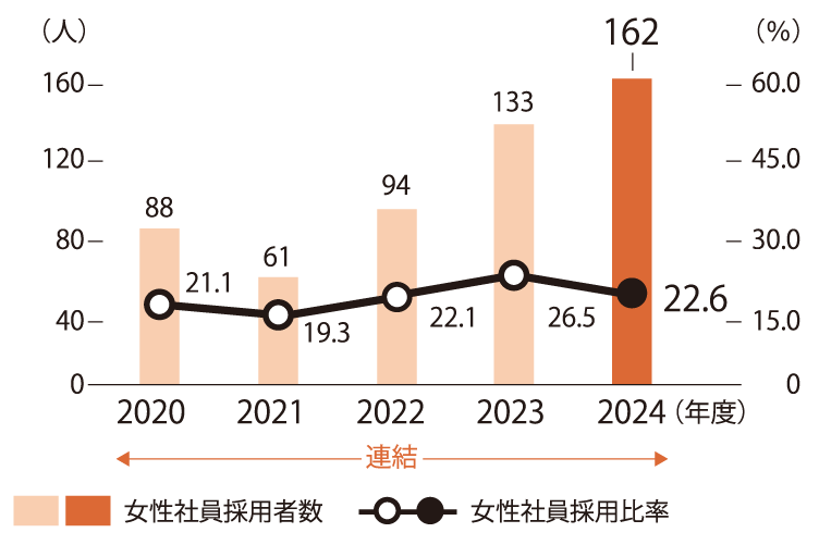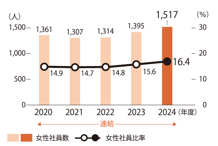2021年4月に「女性の活躍推進に向けての行動計画」を策定し、さらなる女性活躍推進に向け、ベースとなる女性社員の採用比率の向上や活躍の場の拡充を図っています。さらに、2020年度以降当社の女性執行役員・管理職4名が社会的な影響力や人財育成、地域貢献など多面的な活躍が評価され、大阪商工会議所から「活躍する女性リーダー表彰」を受賞しています。